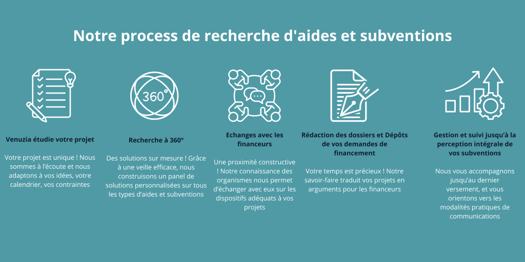 C’est là que se situe l’essentiel de la valeur ajoutée de Venuzia : cibler, pour chaque projet d’investissement, les organismes les plus pertinents, les dispositifs les plus intéressants, optimiser le séquençage et le calendrier de leur demande, rédiger les dossiers de candidature de subvention en adéquation avec les attendus spécifiques de chacun des financeurs et sécuriser leur concrétisation.